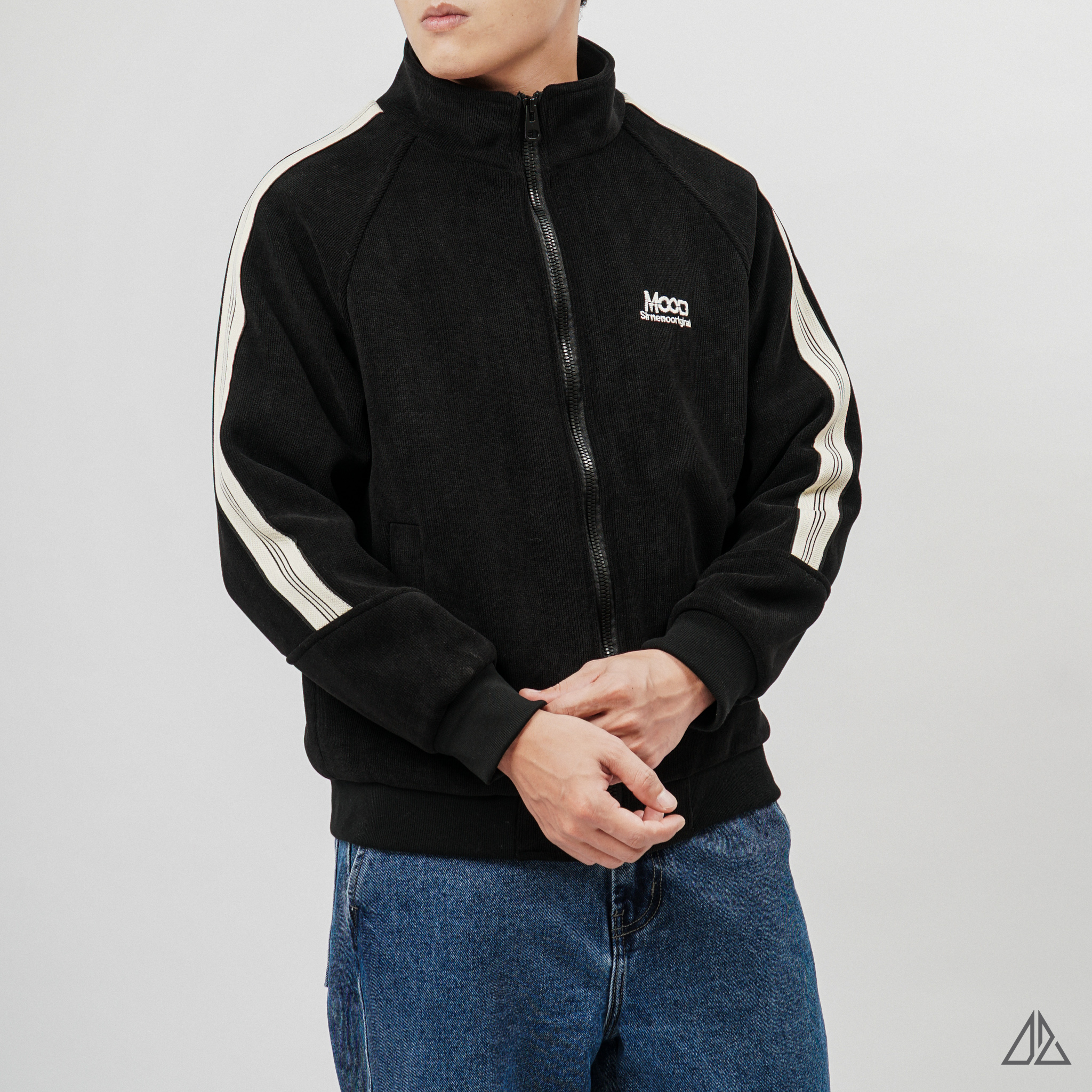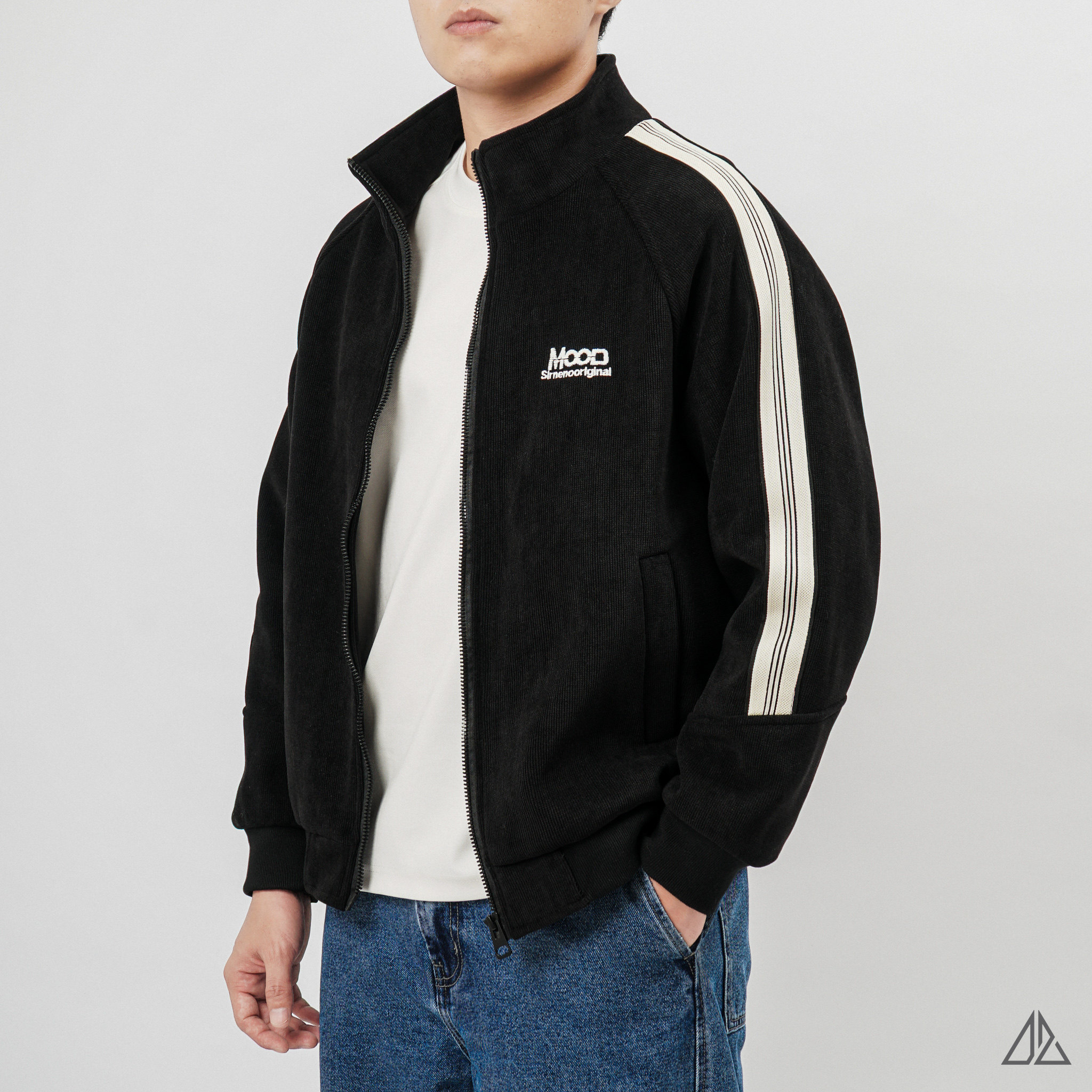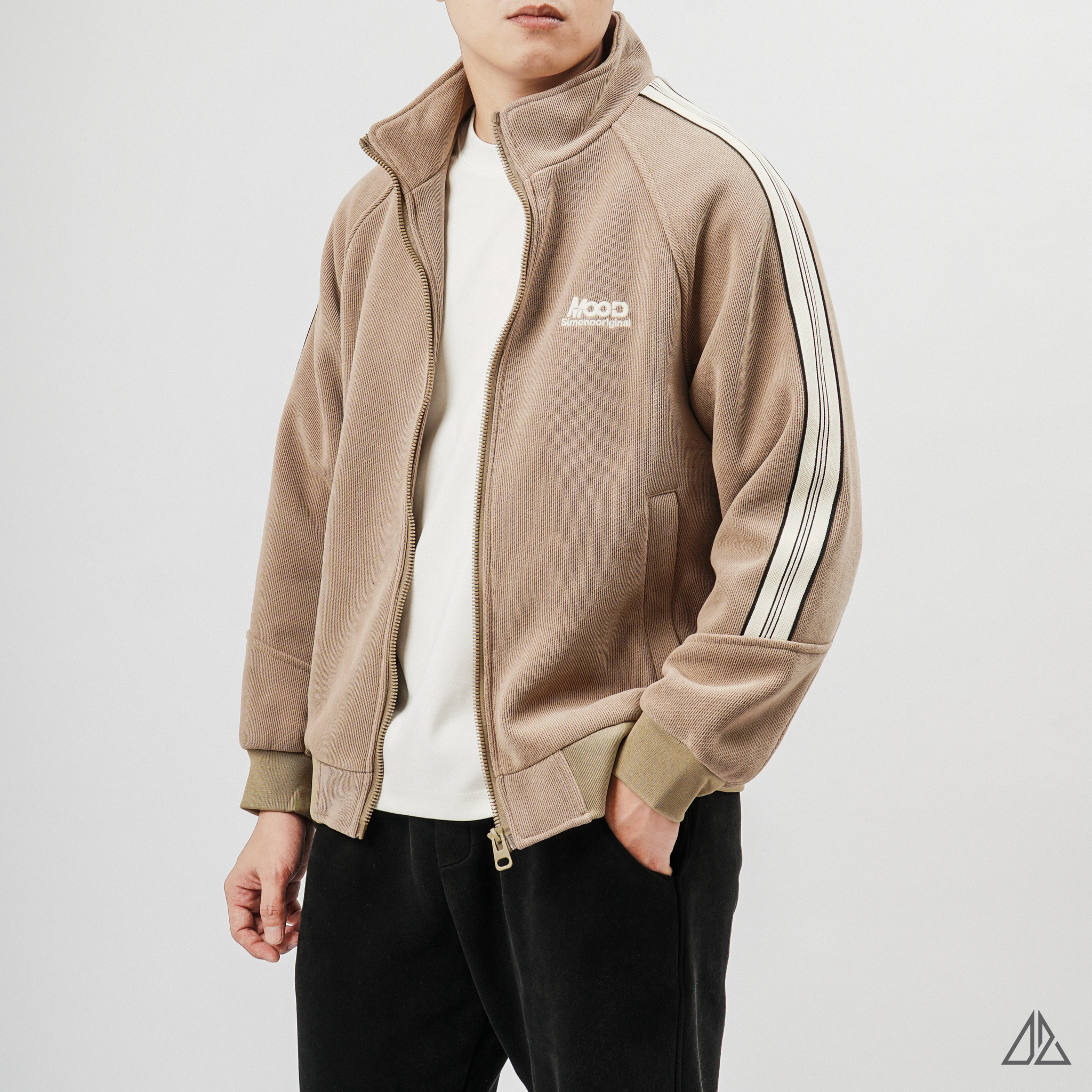 Về thiết kế: K-6609 sở hữu phom dáng Regular Fit thoải mái với phần tay áo Raglan linh hoạt. Điểm nhấn đắt giá nằm ở dải line trắng chạy dọc từ vai xuống tay áo, tạo nên vẻ ngoài khỏe khoắn, năng động (Sporty Chic). Chi tiết logo thêu "MOOD" trước ngực và patch da dập nổi phía sau lưng được xử lý tinh tế, khẳng định gu thẩm mỹ tối giản nhưng không đơn điệu.