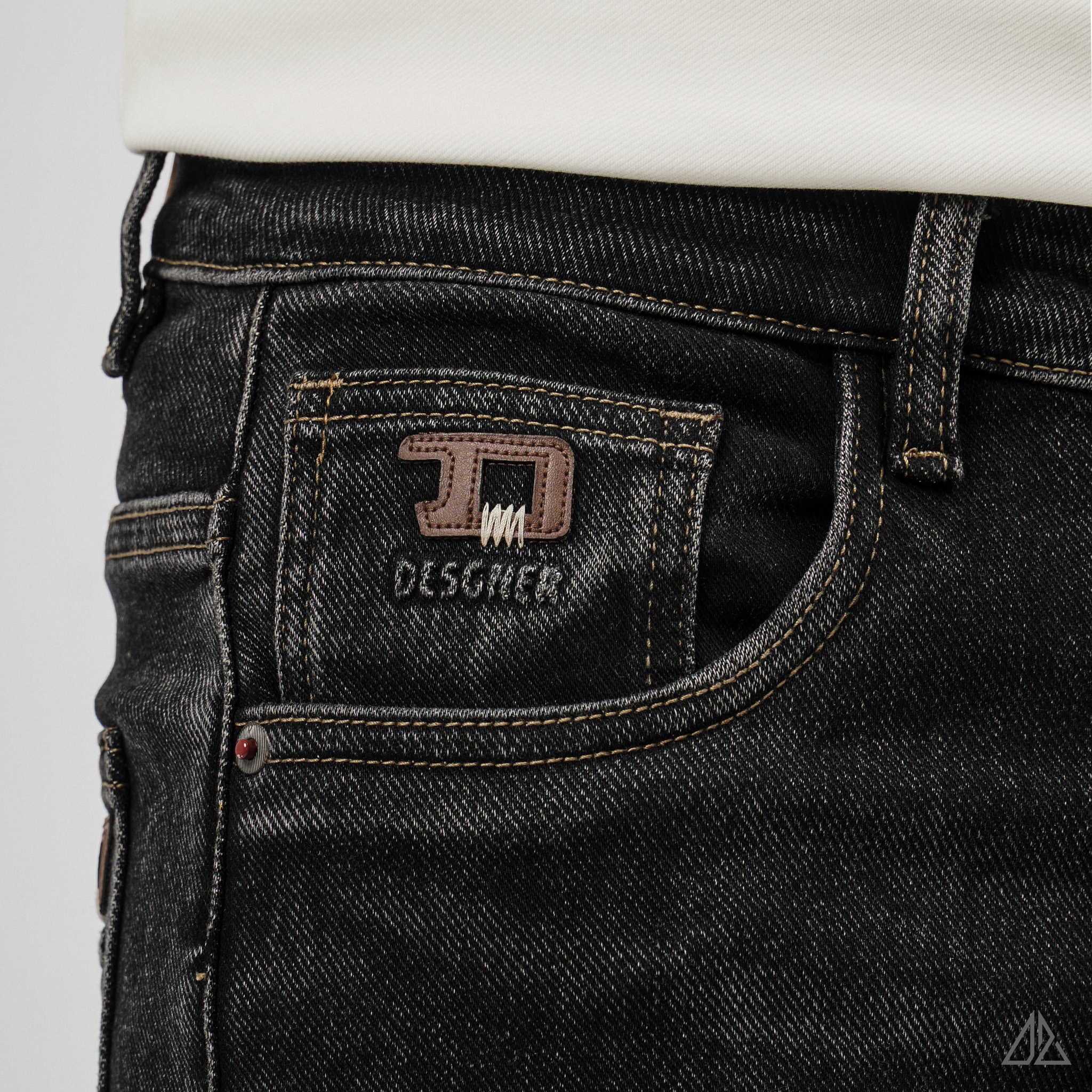 • Dấu ấn túi nhỏ phía trước (Coin pocket) và túi sau đều được trang trí bằng logo da nâu khắc chữ "DESIGNER" kèm biểu tượng chữ D cách điệu. Sự kết hợp giữa nền vải đen và tag da nâu tạo nên hiệu ứng thị giác sang trọng.