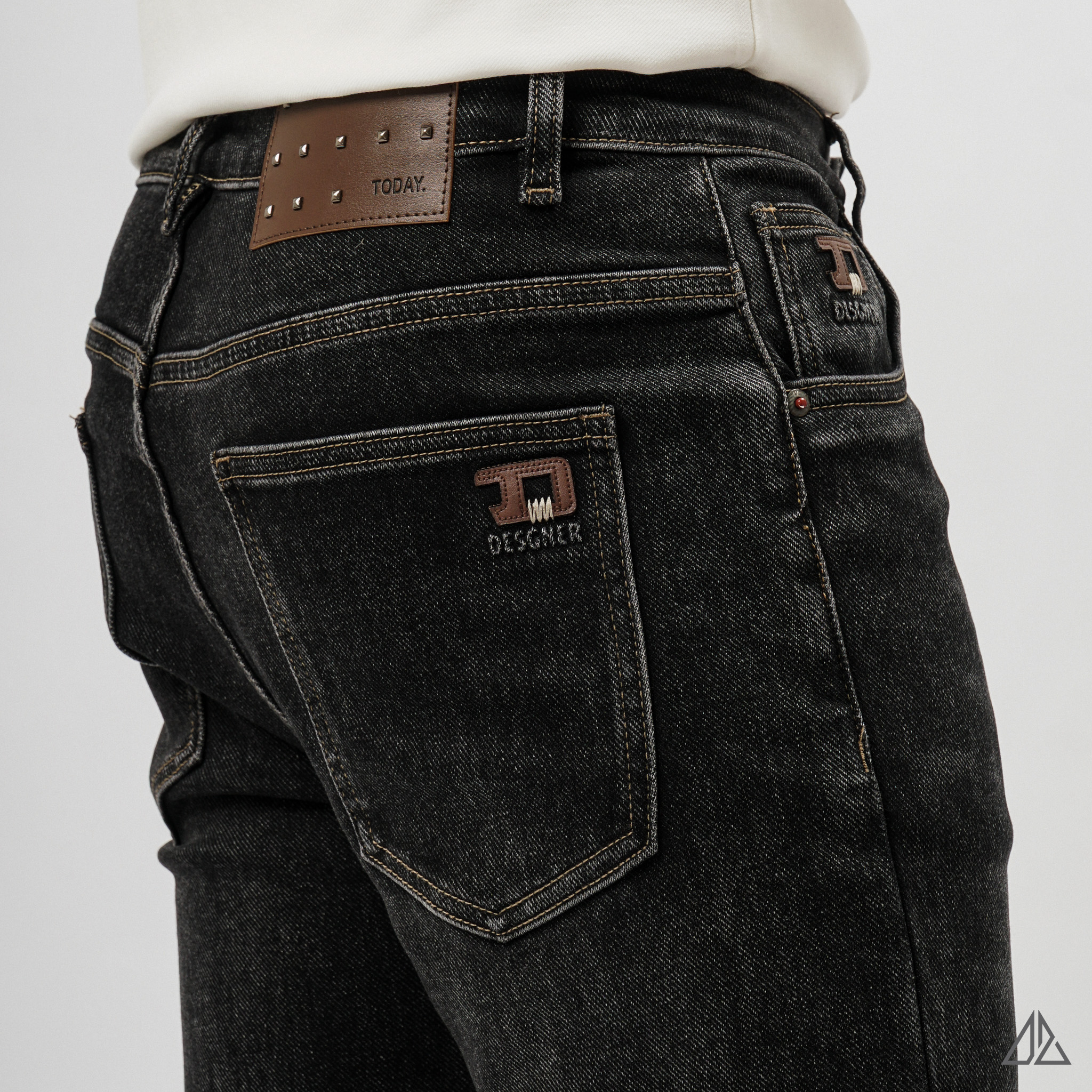 • Điểm nhấn kim loại: Tag da ở lưng quần được đính 4 đinh tán kim loại vuông vức cùng dòng chữ "TODAY." tối giản, tạo nên vẻ đẹp mạnh mẽ, hiện đại.