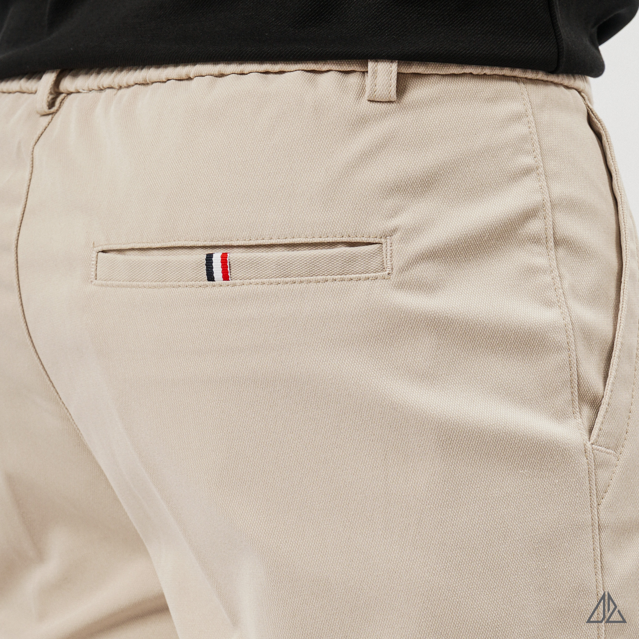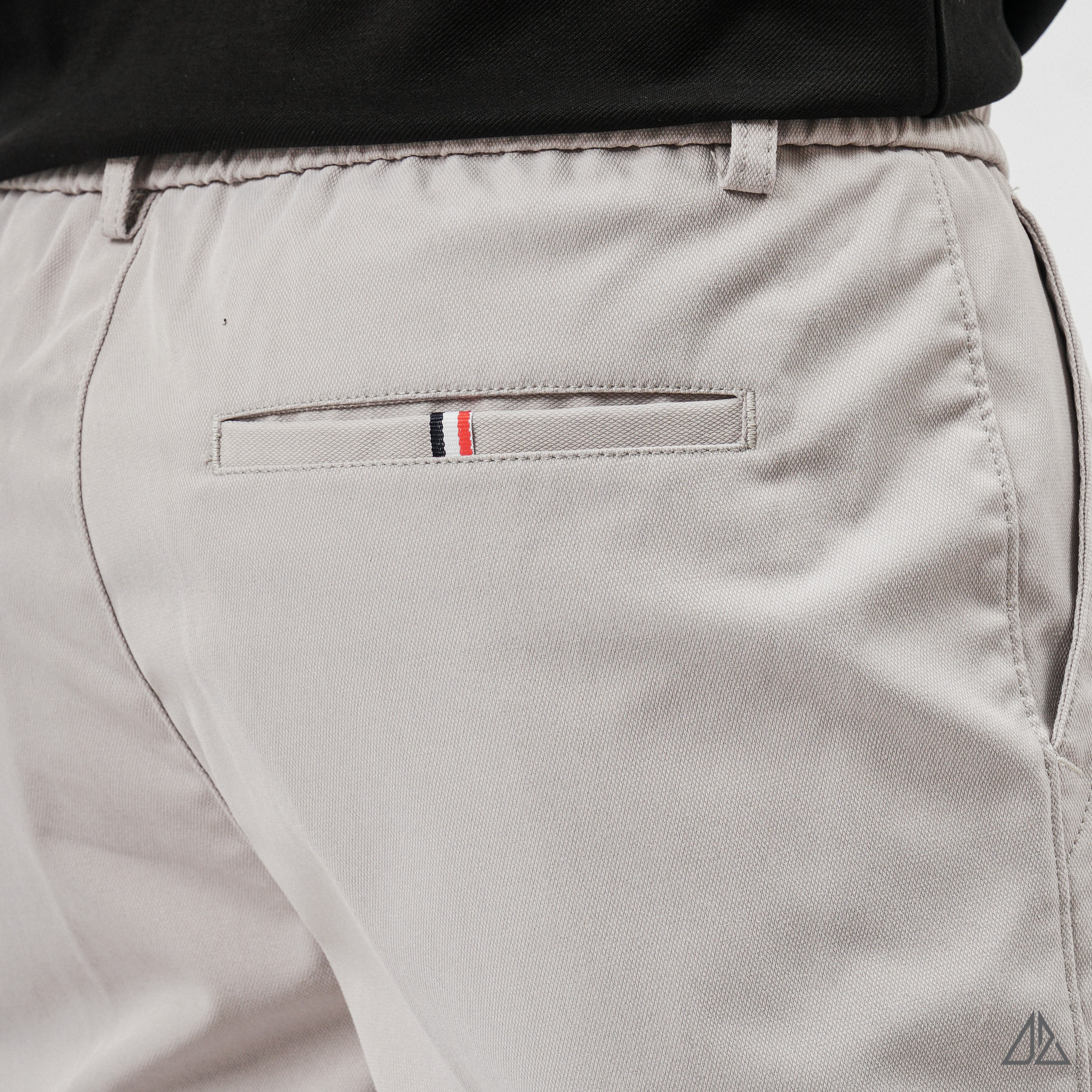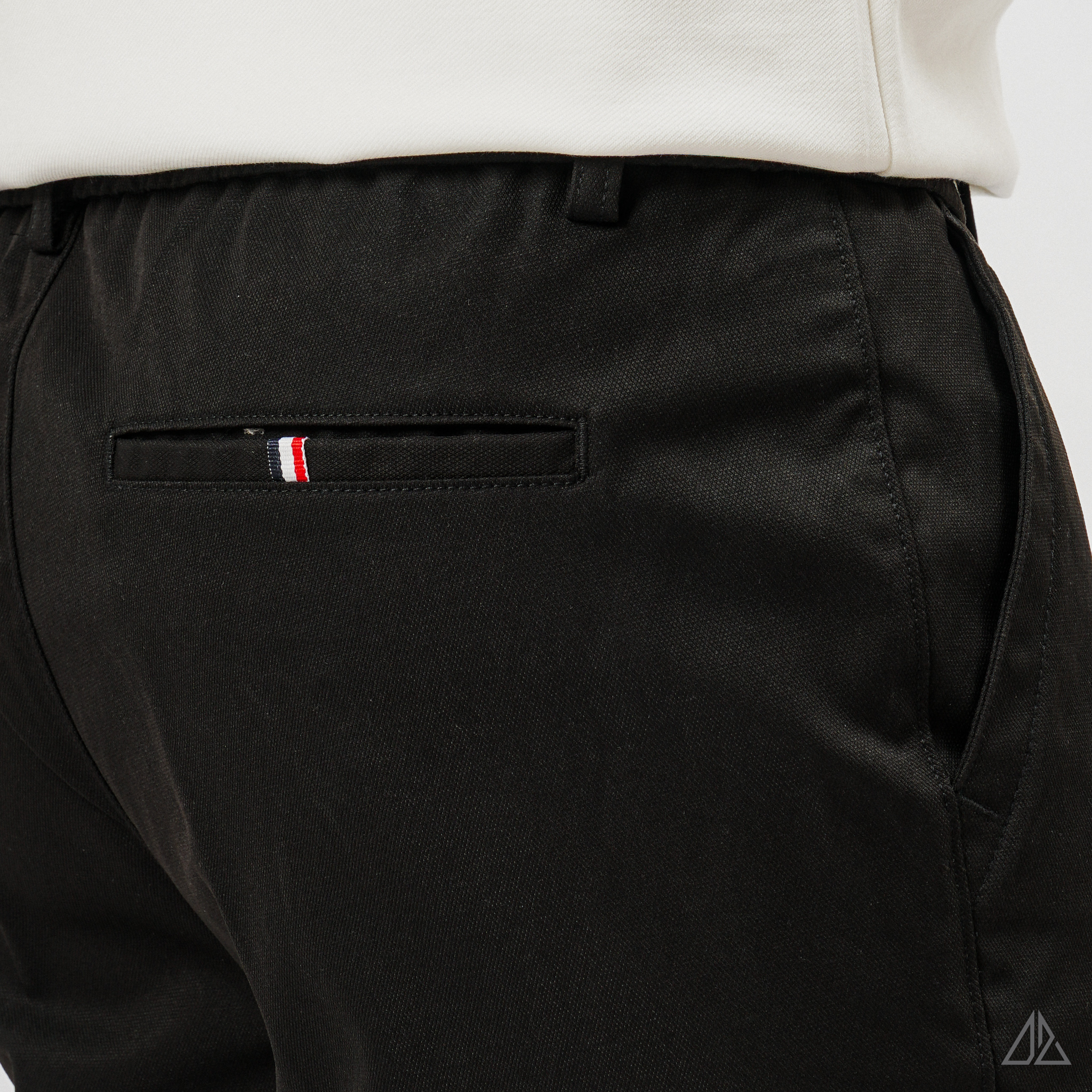 Về thiết kế: Điểm "đắt giá" nhất của L-HKT87 nằm ở thiết kế đai lưng chun sườn (Side-Elastic Waist) cực kỳ tinh tế. Phần chun co giãn được khéo léo đặt ở hai bên hông giúp quần tự động điều chỉnh vừa vặn theo vòng bụng, mang lại sự thoải mái tuyệt đối khi ngồi hoặc sau khi ăn no mà không hề bị lộ hay mất đi vẻ chỉn chu. Phom dáng Regular Fit tiêu chuẩn cùng túi sau dạng túi mổ (Welt Pocket) đính tag 3 màu tạo nên diện mạo gọn gàng, thanh lịch.